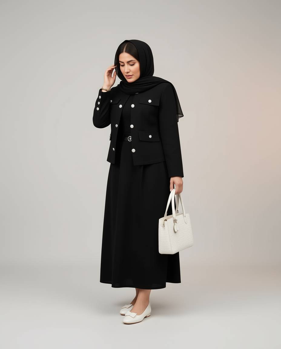 این کار از پارچه کرپ سوپر باربی فرانسه درجه یک تهیه شده است. رنگ آن جت بلک (کاملاً مشکی) بوده و پارچه بسیار لطیف و بدون پرزدهی است. کیفیت این محصول با نمونههای مشابه بازار قابل مقایسه نیست.✅