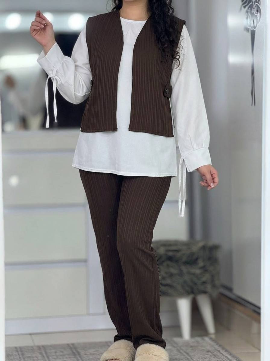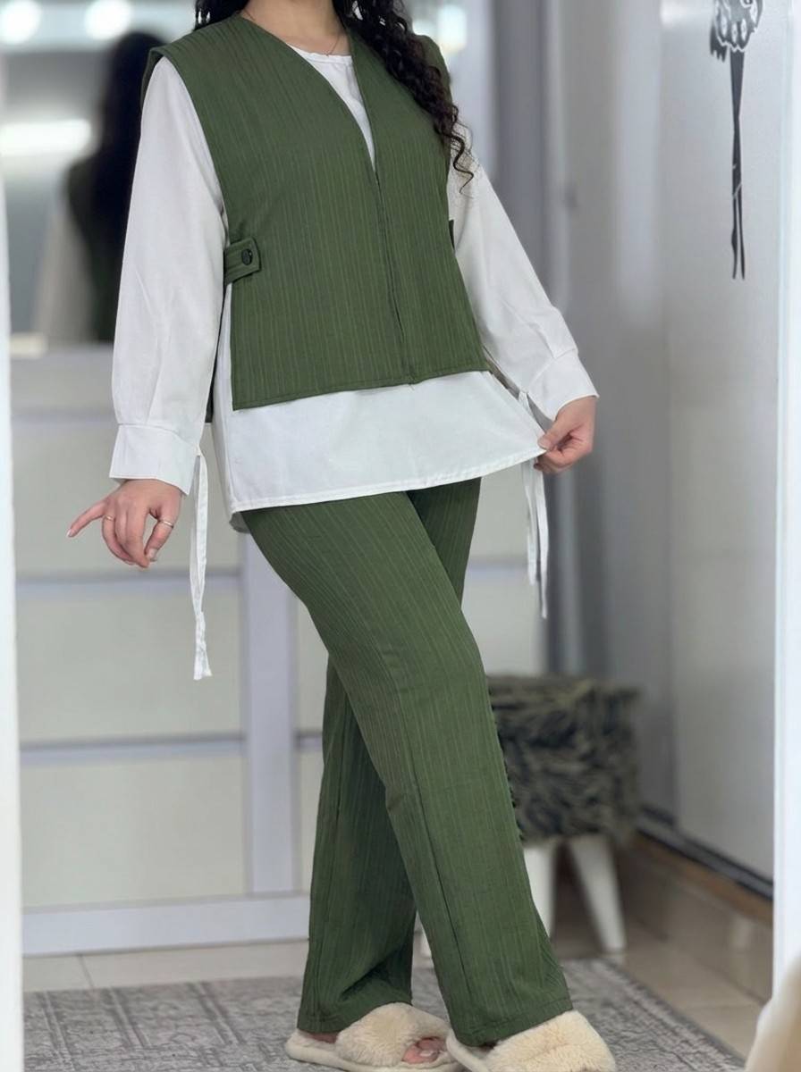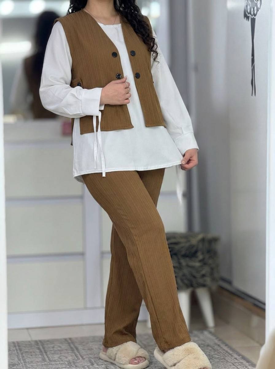 ست عفاف، یک انتخاب هوشمندانه برای خانمهای شیکپوش که به دنبال راحتی و استایل مجلسی در کنار هم هستند. این ست شامل شومیز، وست (جلیقه) و شلوار است که با پارچههای باکیفیت آیوا و داکرون دوخته شده است.