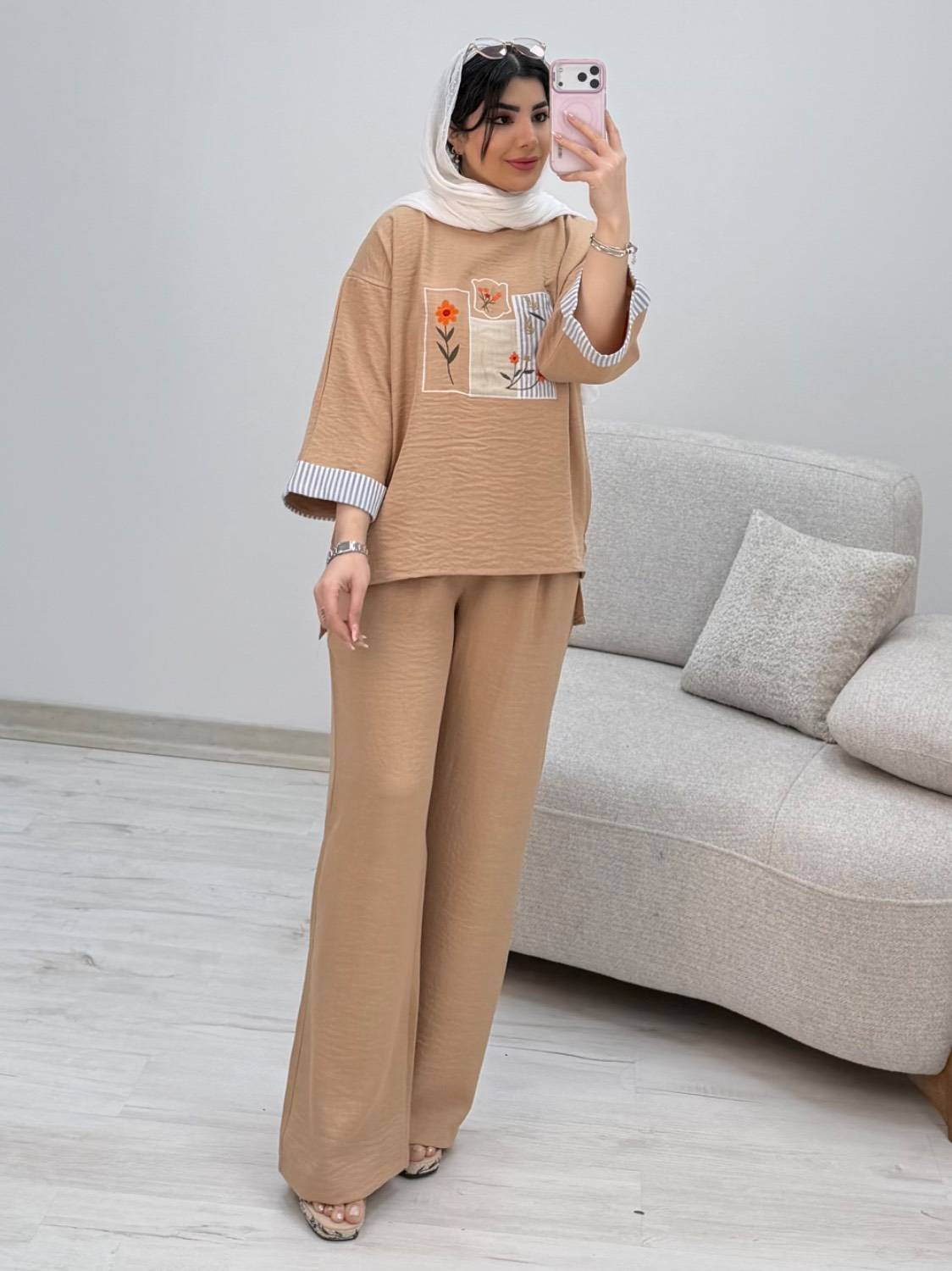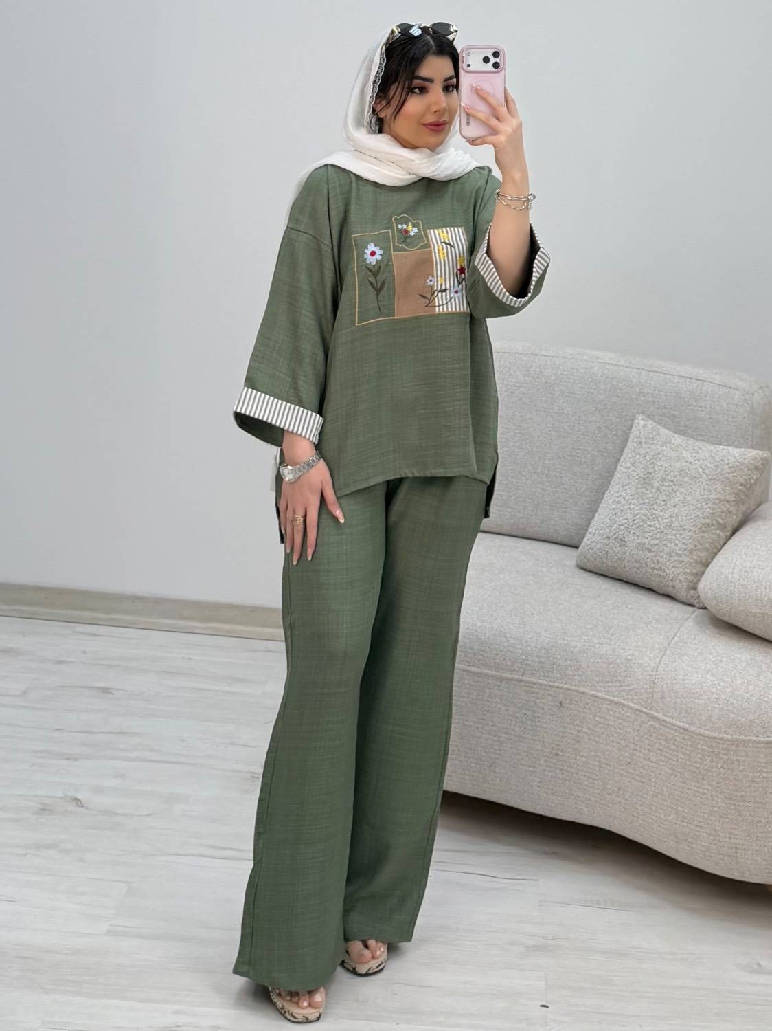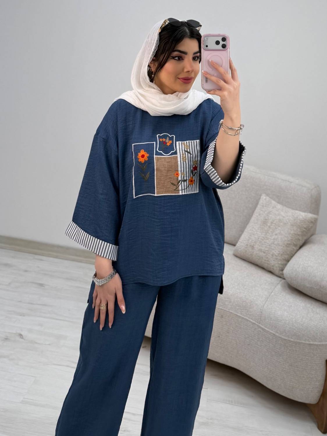 - طراحی مدرن: گلدوزیهای ظریف روی سینه و لبههای تاشوی آستین، جلوهای لوکس به این ست بخشیده.