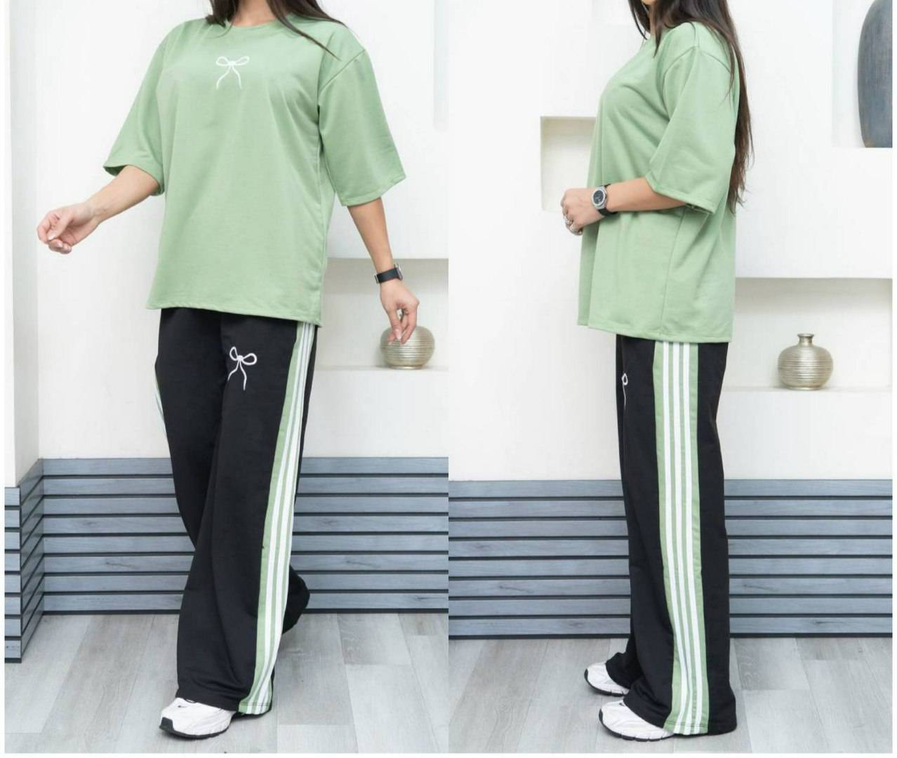 ست تیشرت شلوار پاپیونی کالباسی با نوار سفید کناری شلوار اسپرت