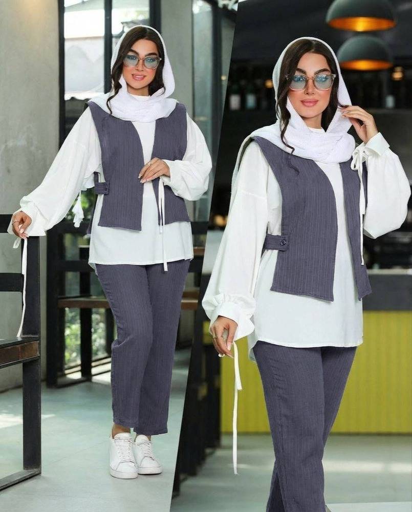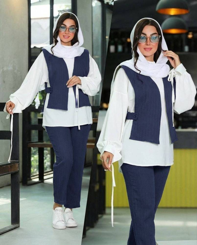 اگر به دنبال ستی هستید که هم شیک و مدرن باشد و هم راحت و کاربردی، ست عفاف F دقیقاً همان چیزی است که کمد لباستان کم دارد! این ست سهتیکه شامل شومیز سفید یقهدار، وست (جلیقه) راهراه و شلوار ست است که با جنس آیوا و داکرون دوخته شده و حس لطافت و کیفیت را همزمان به شما هدیه میدهد.