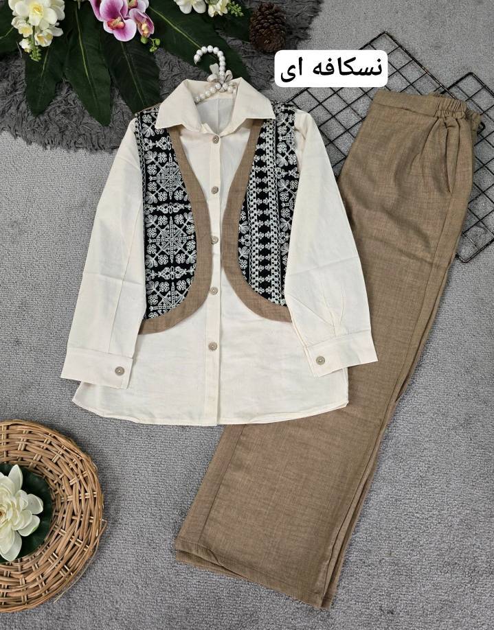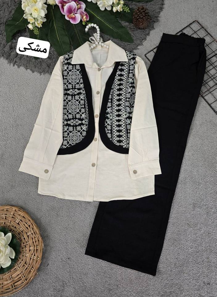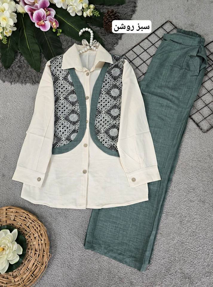 🌟 ست شومیز لنین و جلیقه خامه دوزی مدل سلما H