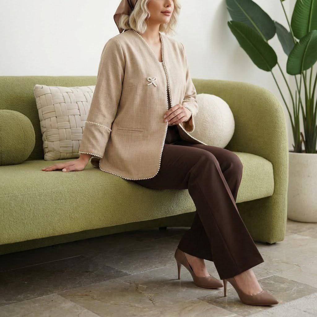 🔹 جزئیات لوکس: مرواریددوزی روی لبهها و پاپیون ظریف، این مانتو رو از هر مانتوی معمولی متمایز میکنه.